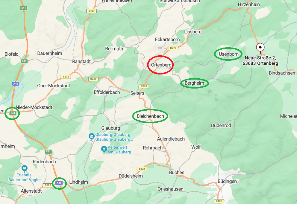 Von Südwesten über die A 45 könnt Ihr bereits die AS 39 Altenstadt abfahren und die B521 Richtung Büdingen fahren um nach Bleichenbach zu kommen.